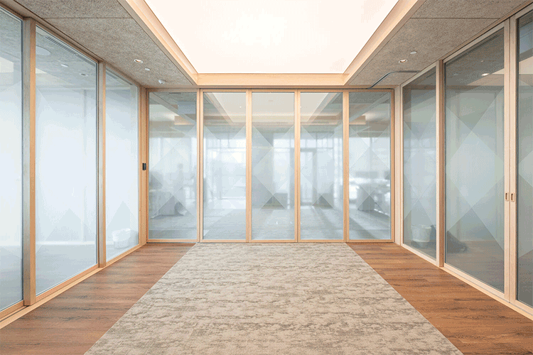 Traditionally constructed out of paper, these movable screens are reimagined in acoustic glass and solid timber with a printed kumiko (wooden latticework)-inspired film formed by intersecting lines that create a gradient of visual privacy necessary for each space.
