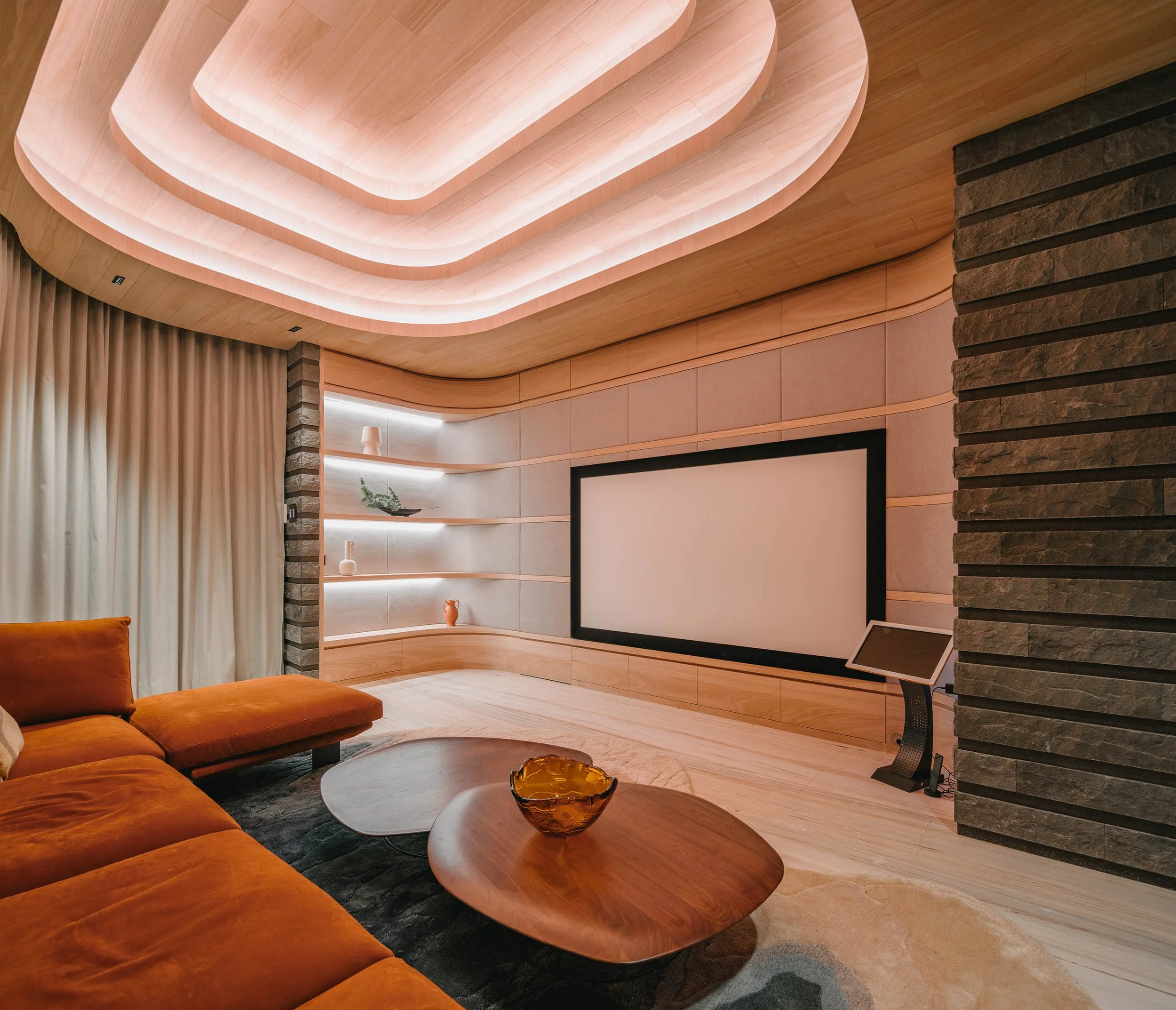 The 1000sqt 5 bedrooms penthouse house, features amenities such as study rooms, a gym, a swimming pool and kitchens. The hard, natural edges of these chiseled basaltina walls are a foil for more informal shapes, such as the gym and movie room. These spaces are enclosed in curved glass and copper-toned stainless steel where the polished surfaces reflect its texturally diverse intriguing surroundings. Inside the stainless steel shell, sound absorption panels, speakers and projection are fully integrated into the walls of the pod, creating a truly immersive audio-visual experience.